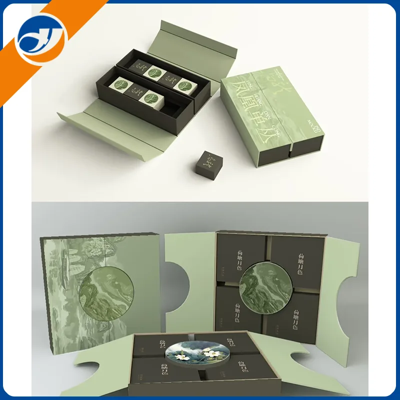 अस्तर और आंतरिक समर्थन: 1500g कार्डबोर्ड इनर बॉक्स दृढ़ता से उपहारों की रक्षा करता है, ईवा/स्पंज आंतरिक समर्थन परिवहन सुरक्षा सुनिश्चित करने के लिए नाजुक वस्तुओं (जैसे चंद्रमा केक, चाय सेट) को ठीक करता है।